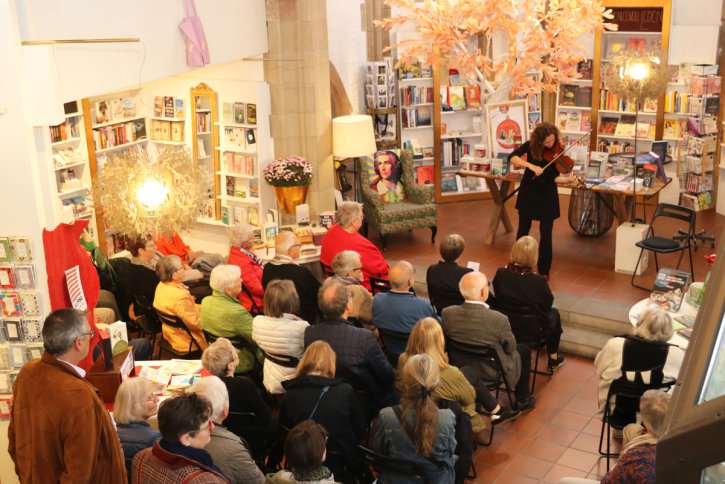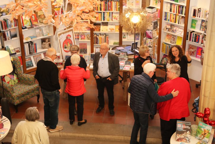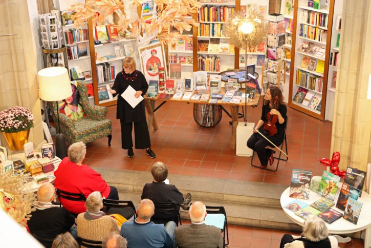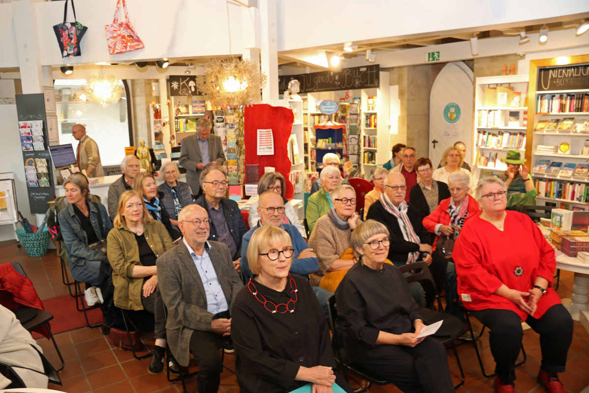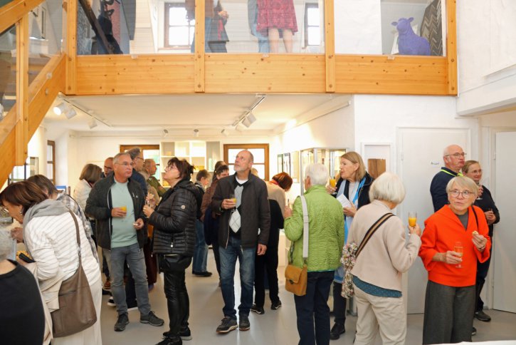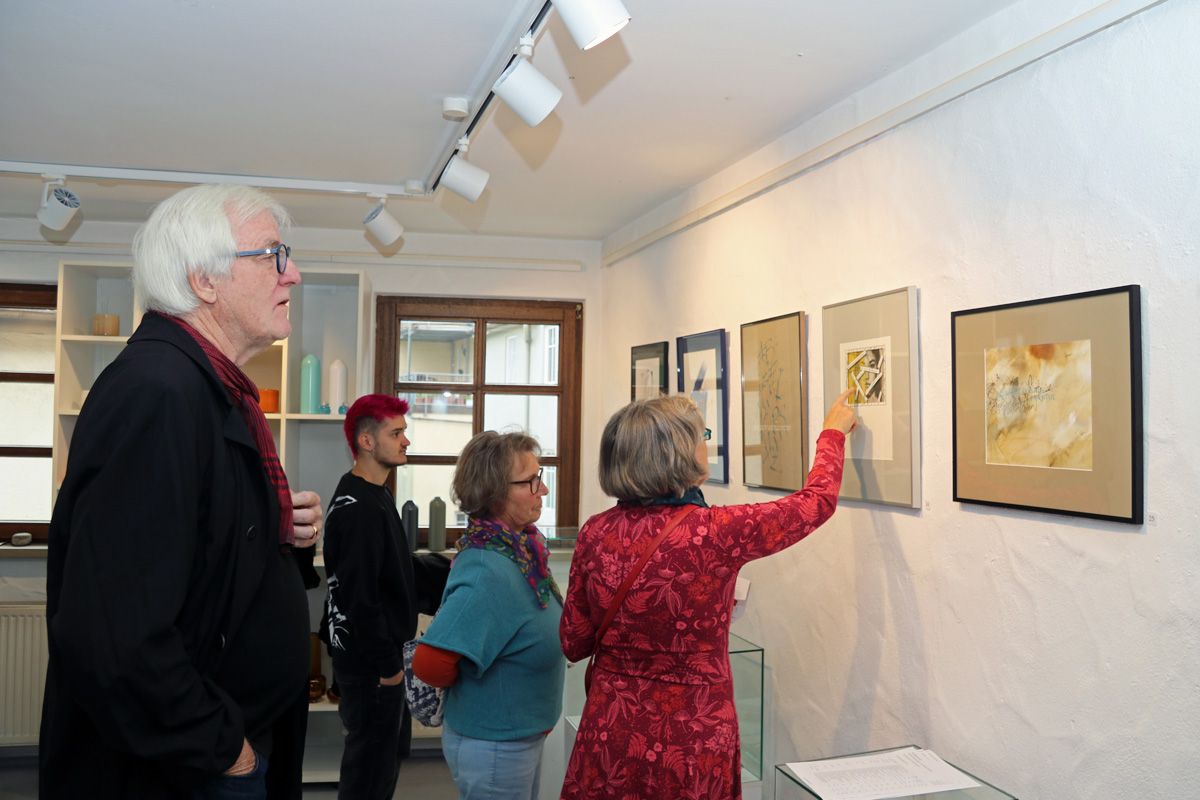 Bei der Ausstellungseröffnung platzte die Galerie aus allen Nähten - so viele kunstinteressierte Gäste waren gekommen. Kurzerhand haben wir die Eröffnung nach unten zu Markus Schneider in die Buchhandlung verlegt.