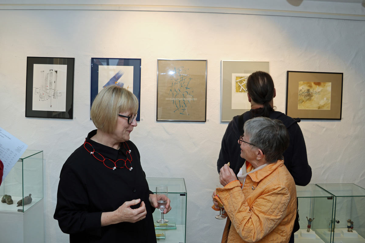 Nach der sachkundigen Einführung durch Manfred Knappe konnten sich die Besucher in Ruhe mit den Bildern, Objekten und Installationen beschäftigen. Viele nutzten auch die Gelegenheit zu einem Gespräch mit der Karlsruher Künstlerin.